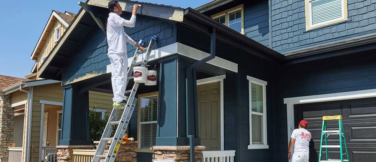 Siding, brick, stucco, fascia/soffits using weather-rated coatings.